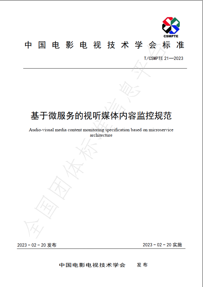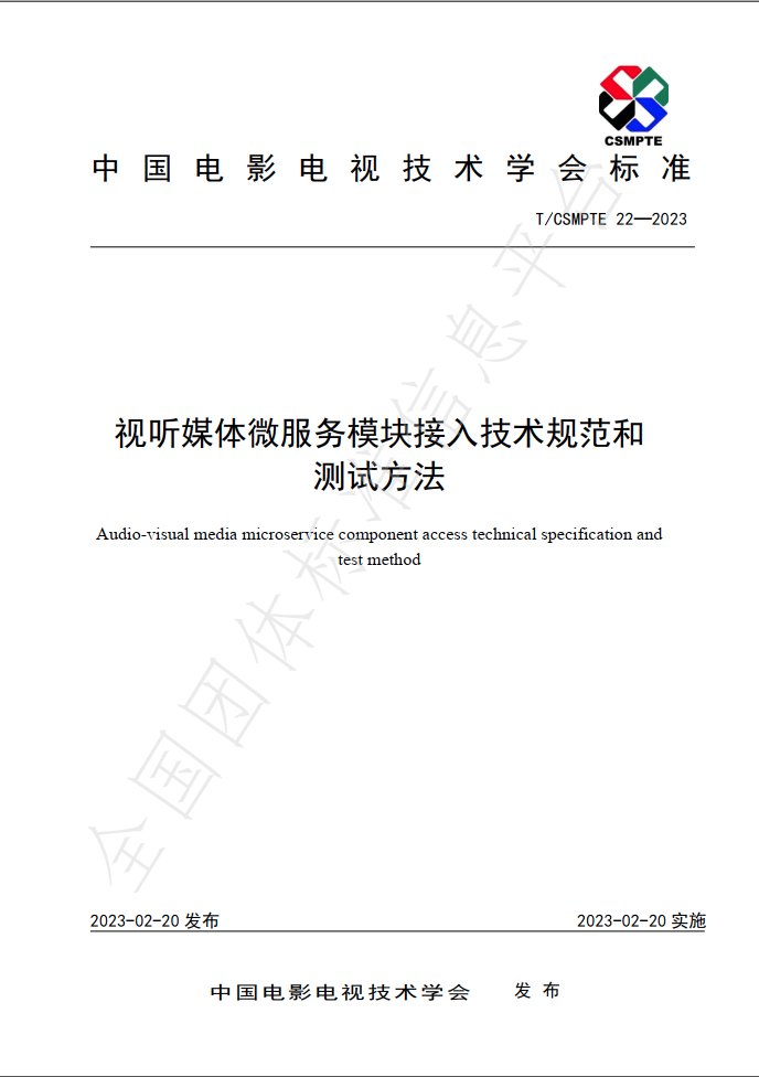 近日,中国电影电视技术学会发布了标准《视听媒体微服务模块接入技术规范和测试方法》,此文件由世界杯竞猜平台智能媒体微服务技术研究与应用国家广播电视总局实验室牵头,联合国家广播电视总局广播电视规划院、国家广播电视总局广播电视科学研究院、湖南广播电视台等多家单位共同研制形成。