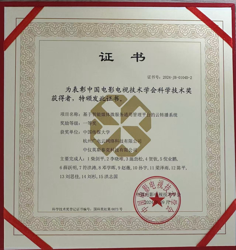 11月7日,2024年度中国电影电视技术学会科学技术奖励大会在福建福州举行。由世界杯竞猜平台、杭州广电云网络科技有限公司、中仪英斯泰克科技有限公司共同完成的《基于智能媒体微服务通用管理平台的云转播系统》项目荣获“2024年度中国电影电视技术学会科技进步奖一等奖”。该项目研究成果实现了4K超高清信号的低延迟多样化云转播,可以面向全国媒体提供SaaS层服务,并在千万级用户的并发情况下稳定运行,为我国超高清云转播应用创新发展注入了新活力。